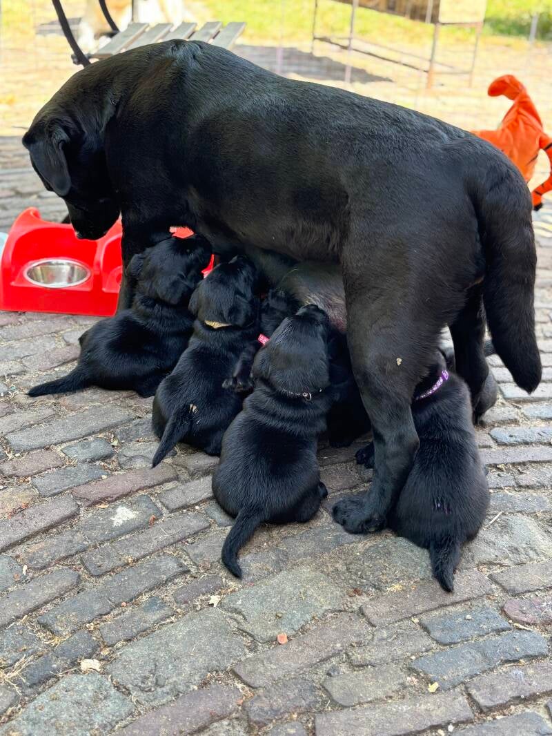 Ze heeft 7 teefjes en 2 reutjes gekregen. Mama en pups maken dat allemaal goed.
